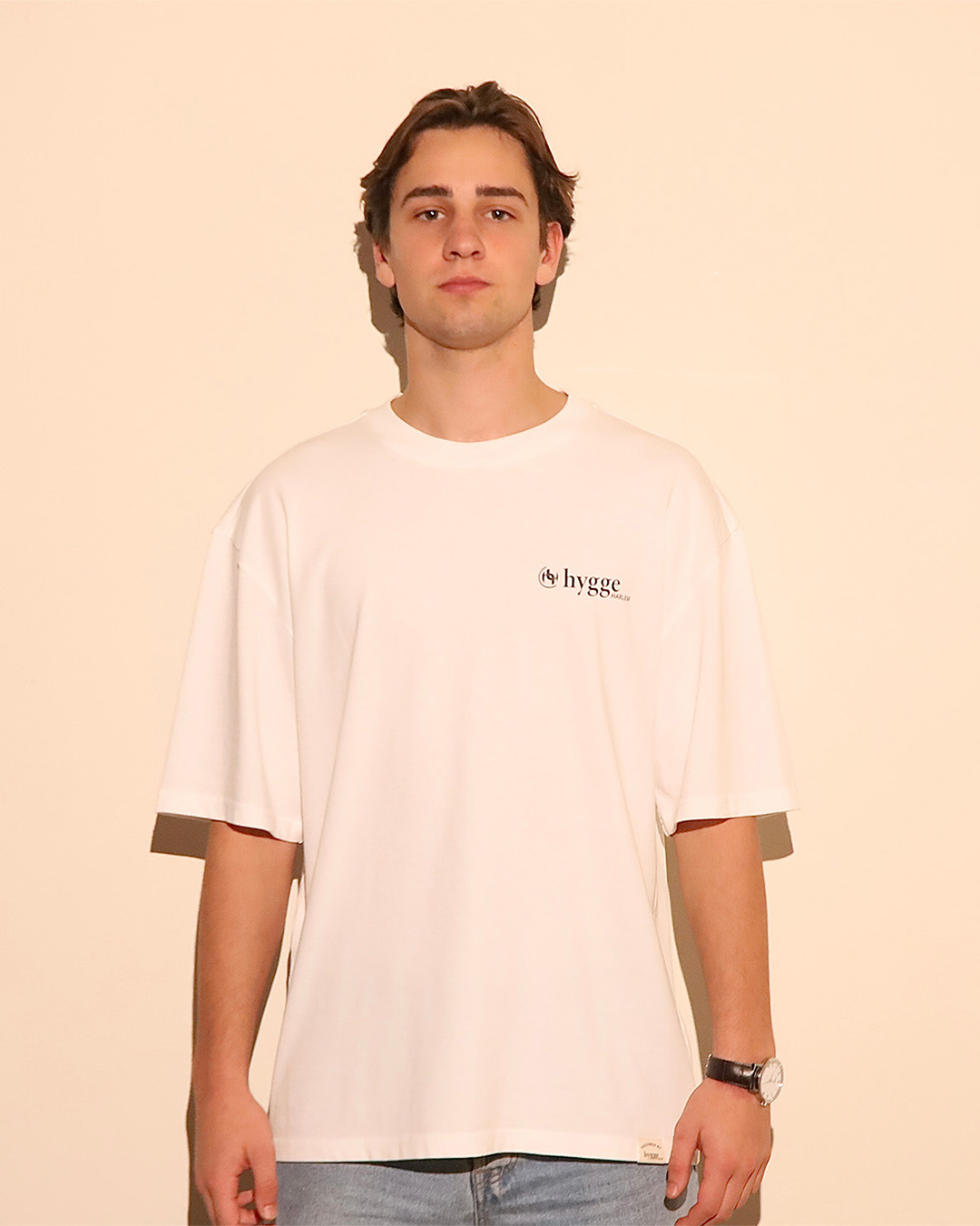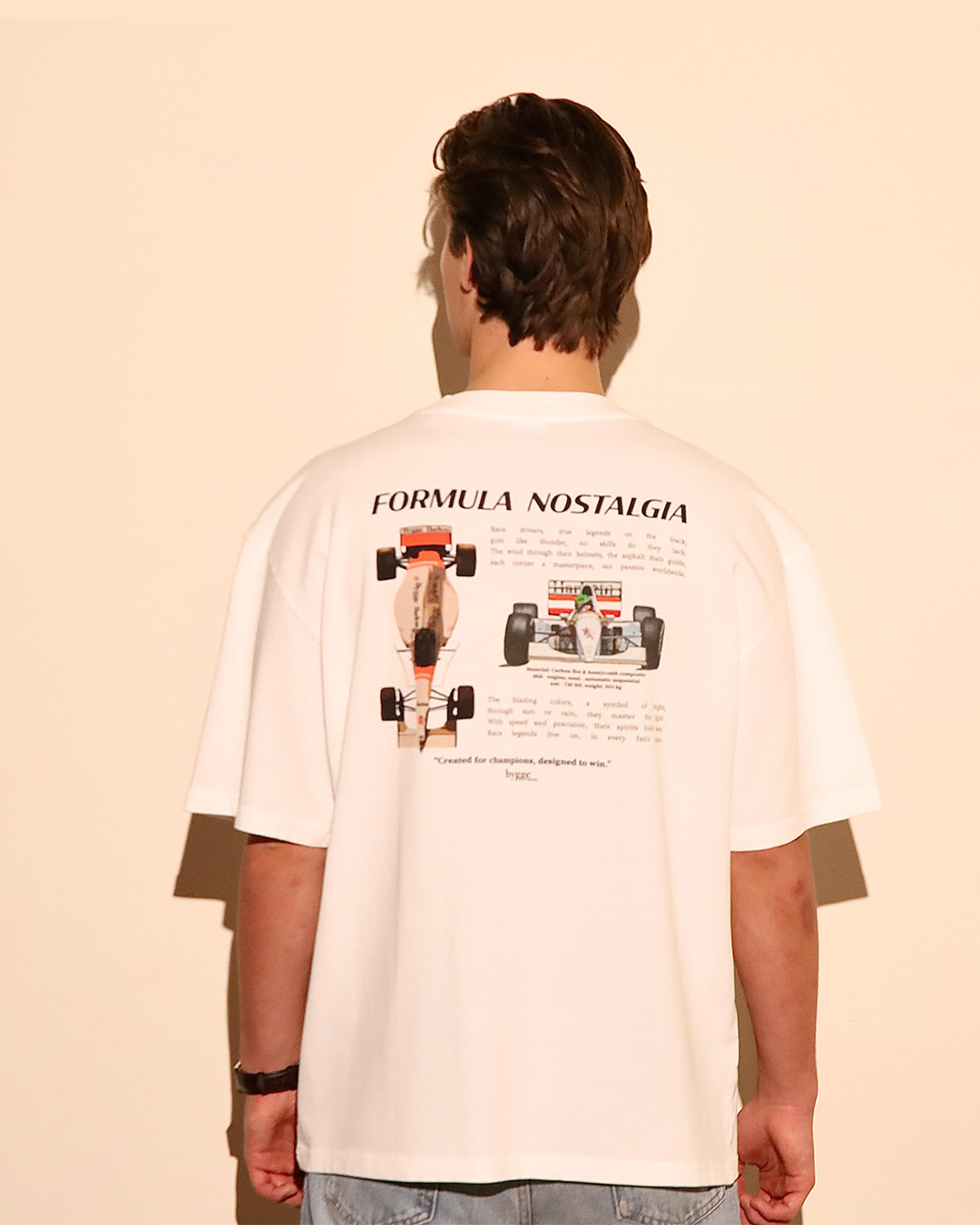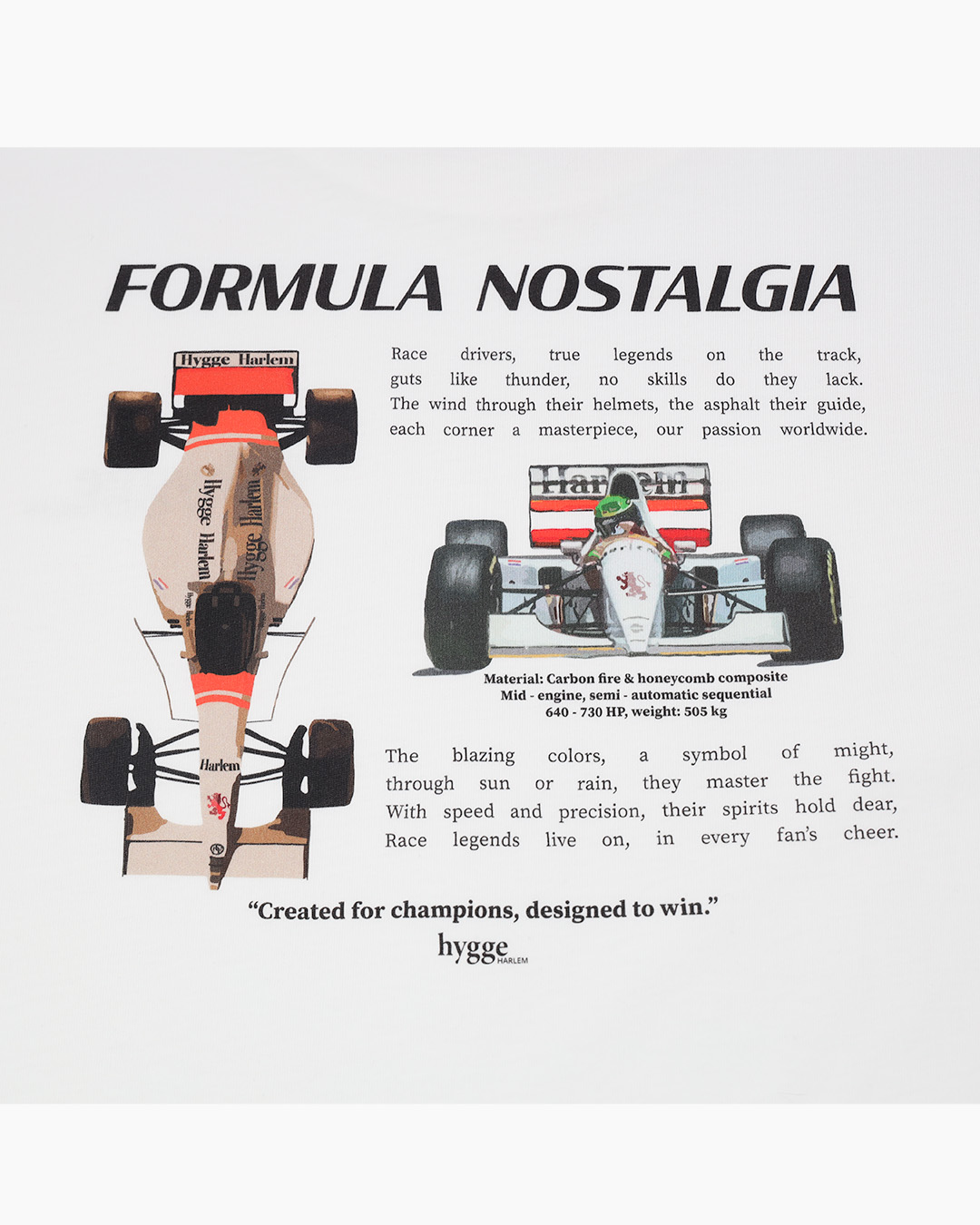 Regular-fit biologisch katoenen wit t-shirt met korte mouwen en ronde hals. Vintage formula race car print op de achterkant en logo print op de voorkant. Met crème wit hygge HARLEM label aan de voorzijde.