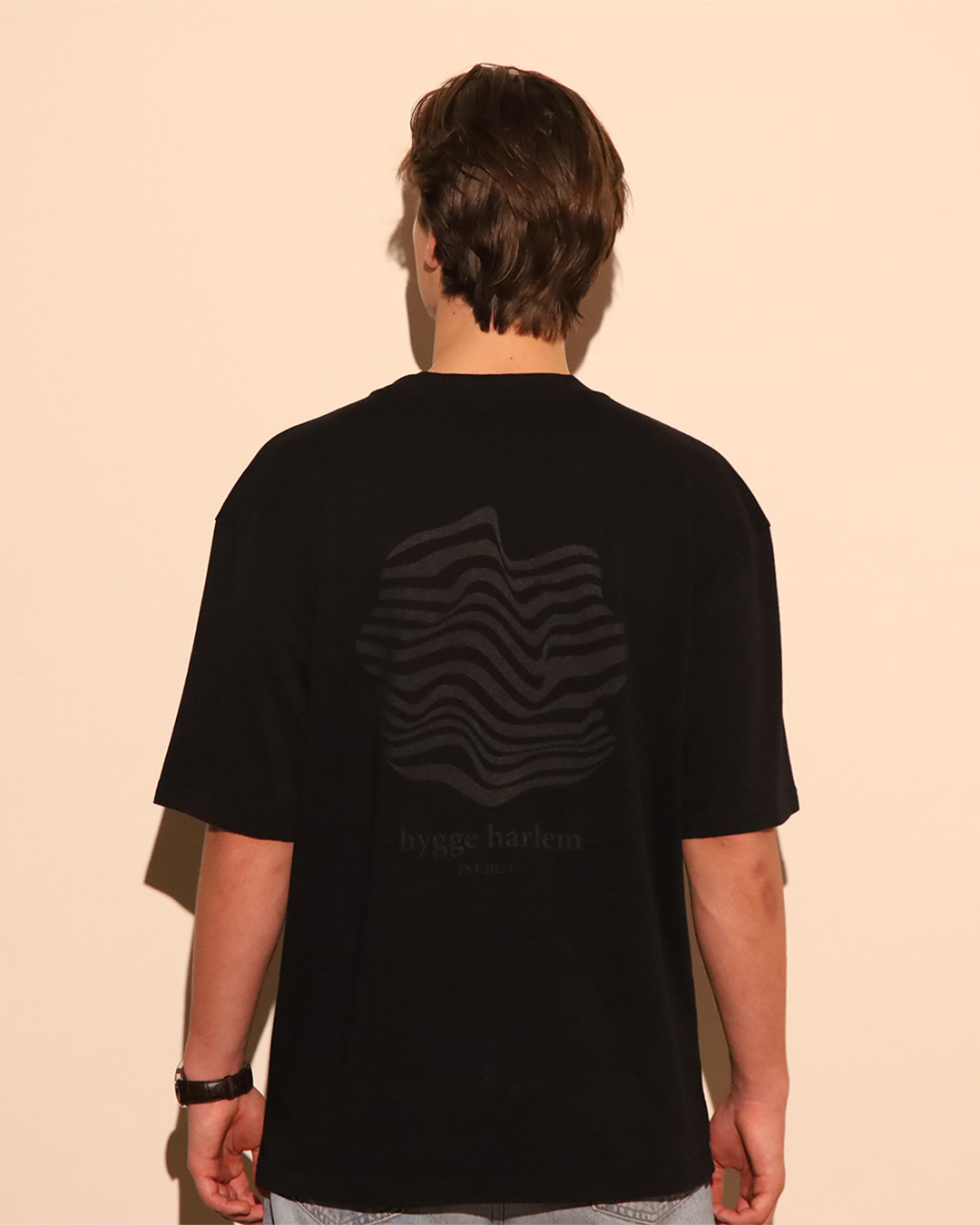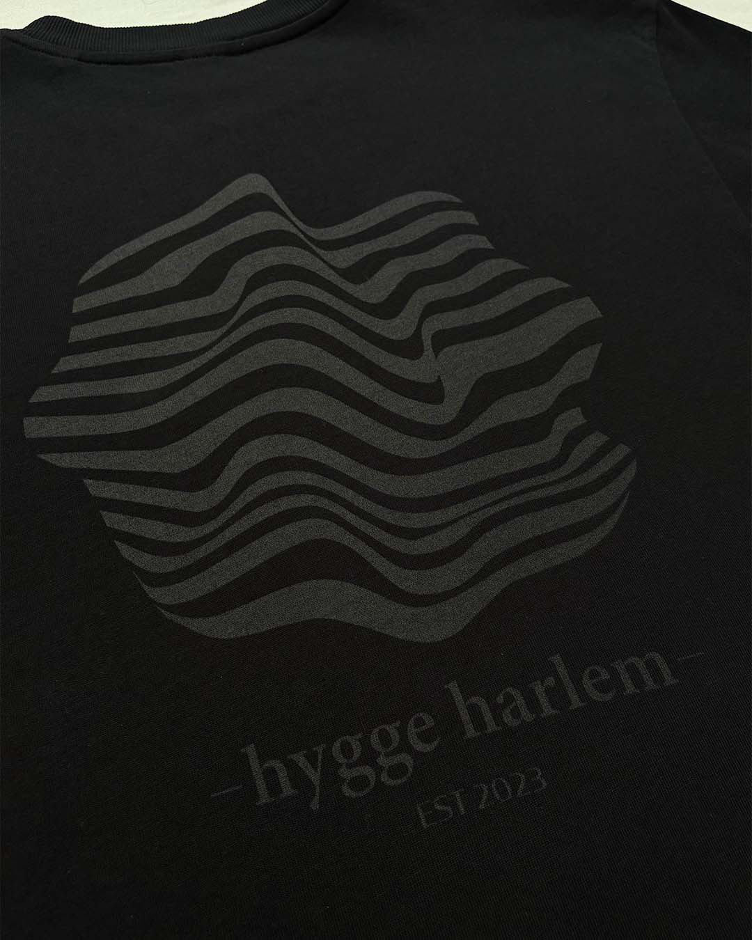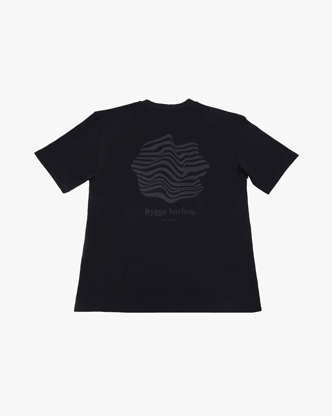 Regular-fit biologisch katoenen t-shirt met korte mouwen en ronde hals. Wave motion print op de achterkant en logo print op de voorkant. Met crème wit hygge HARLEM label aan de voorzijde.