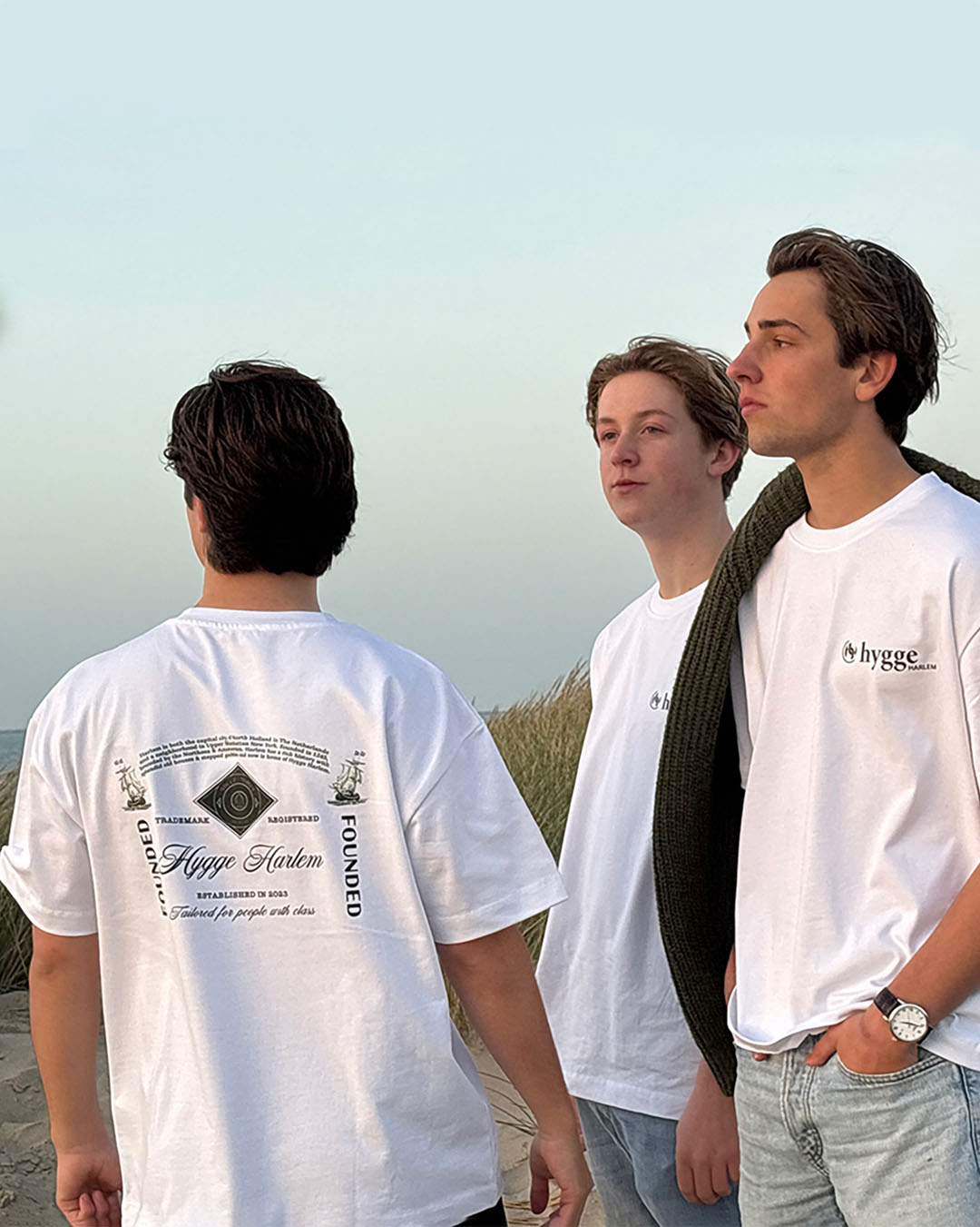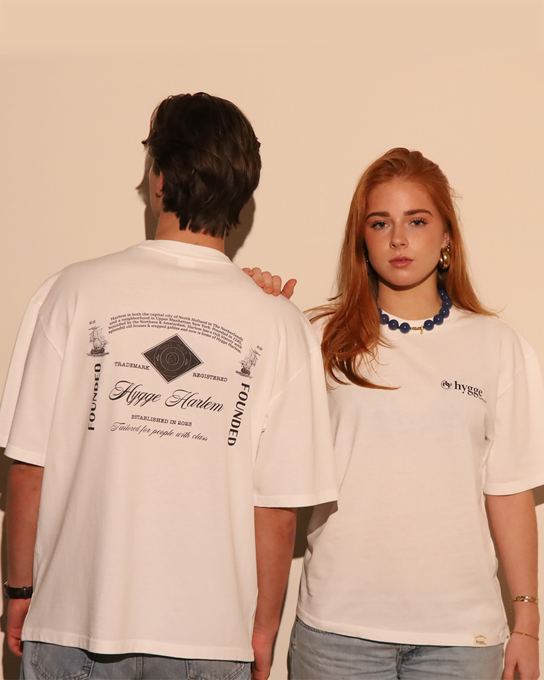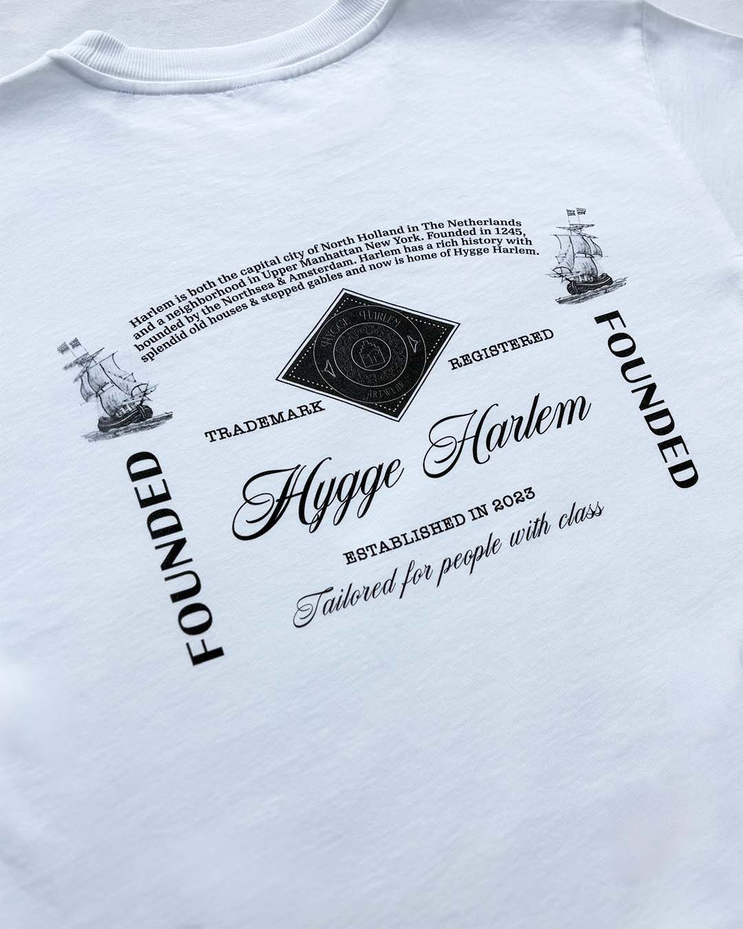 Regular-fit biologisch katoenen t-shirt met korte mouwen en ronde hals. Stijlvol klassiek shirt met old harbour print op de achterkant en een logo print op de voorkant. Met crème wit hygge HARLEM label aan de voorzijde.