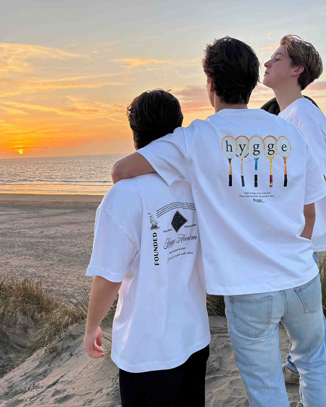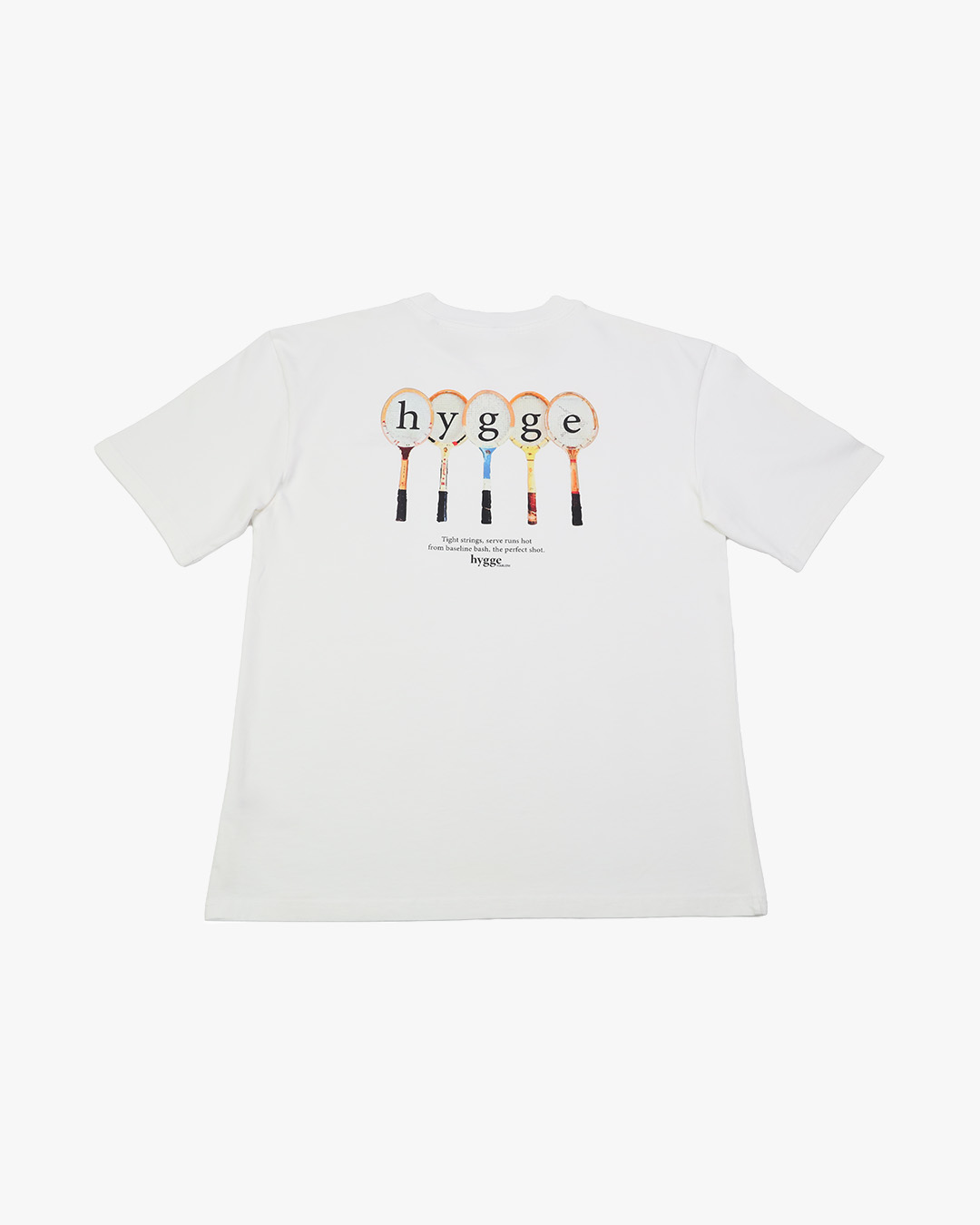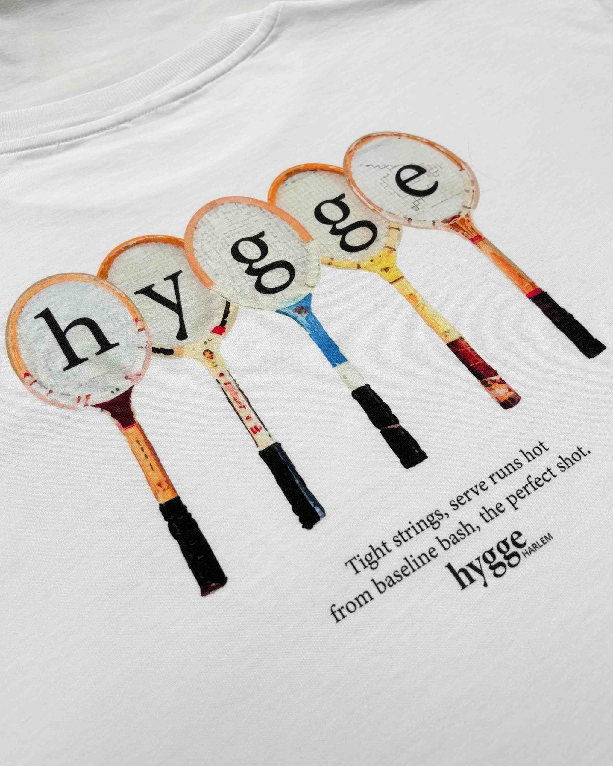 Regular-fit biologisch katoenen wit t-shirt met korte mouwen en ronde hals. Retro tennis print op de achterkant en logo print op de voorkant. Met crème wit hygge HARLEM label aan de voorzijde.